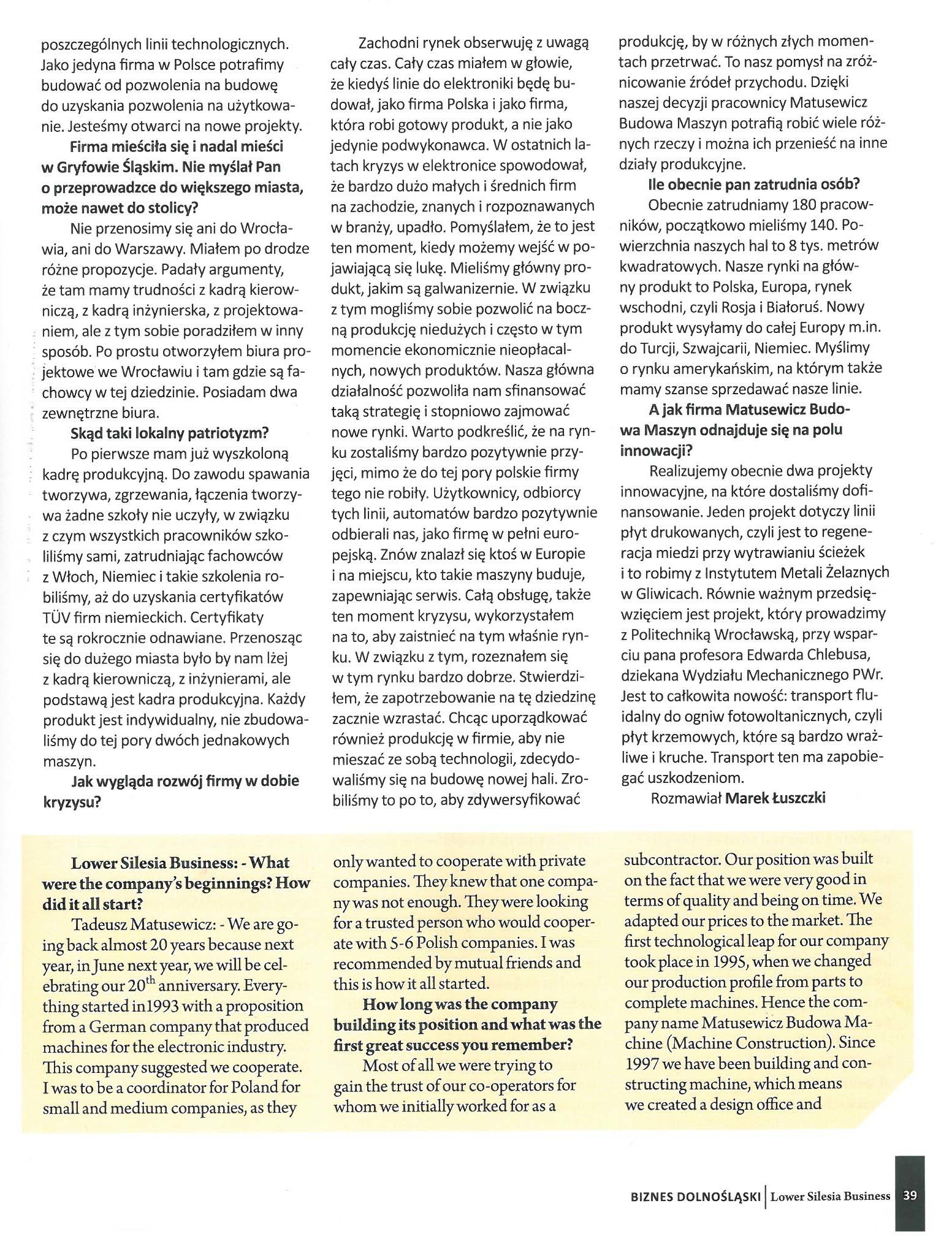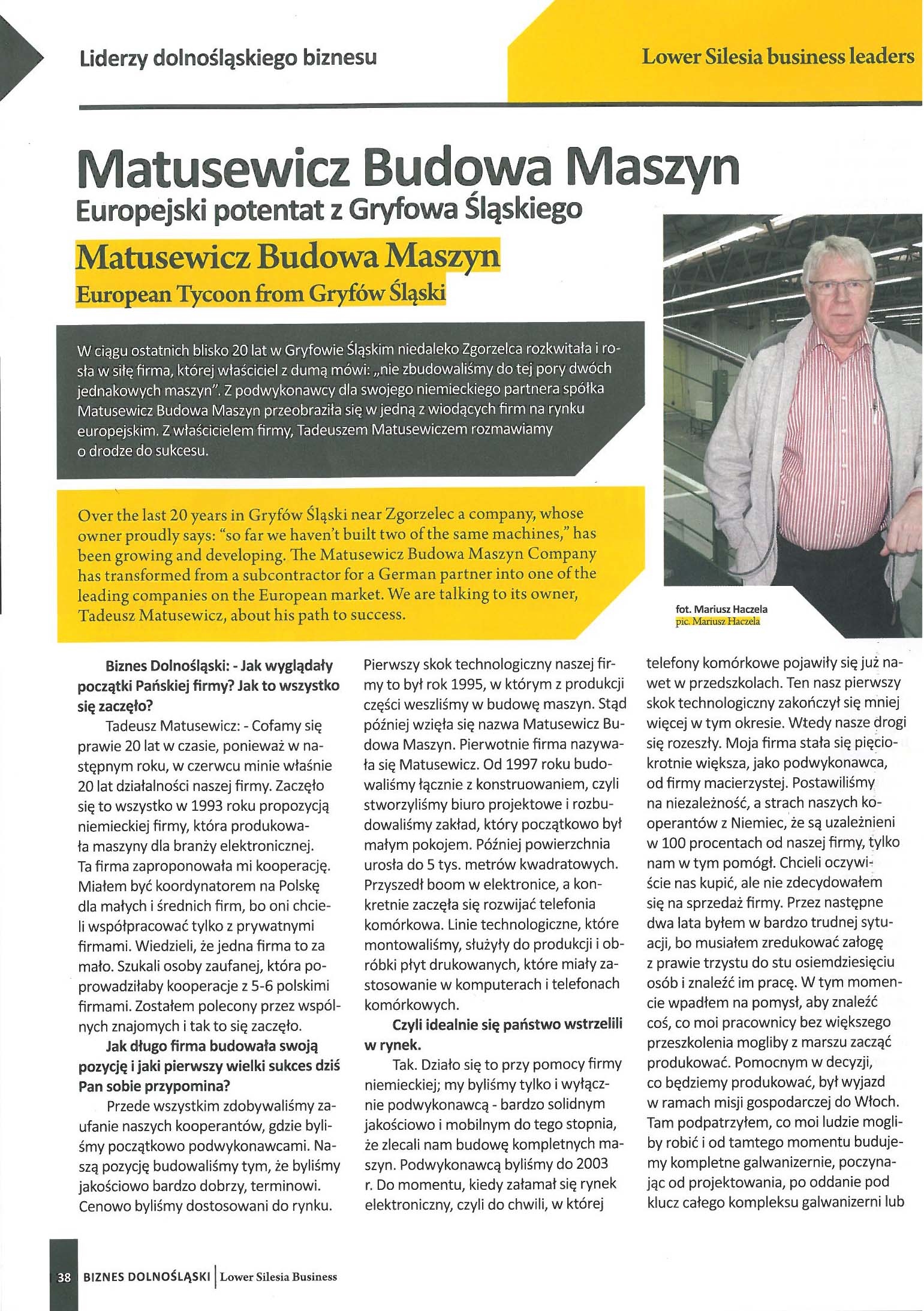 W numerze zimowym Biznesu Dolnośląskiego zamieszczono wywiad z właścicielem firmy Matusiewicz Budowa Maszyn, panem Tadeuszem Matusewiczem, członkiem naszego Klastra.